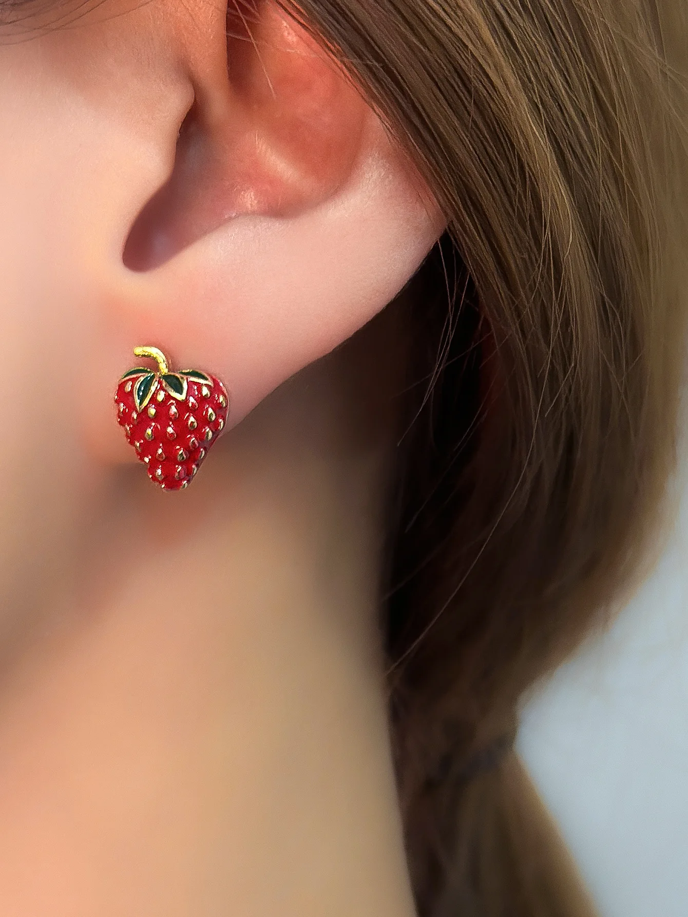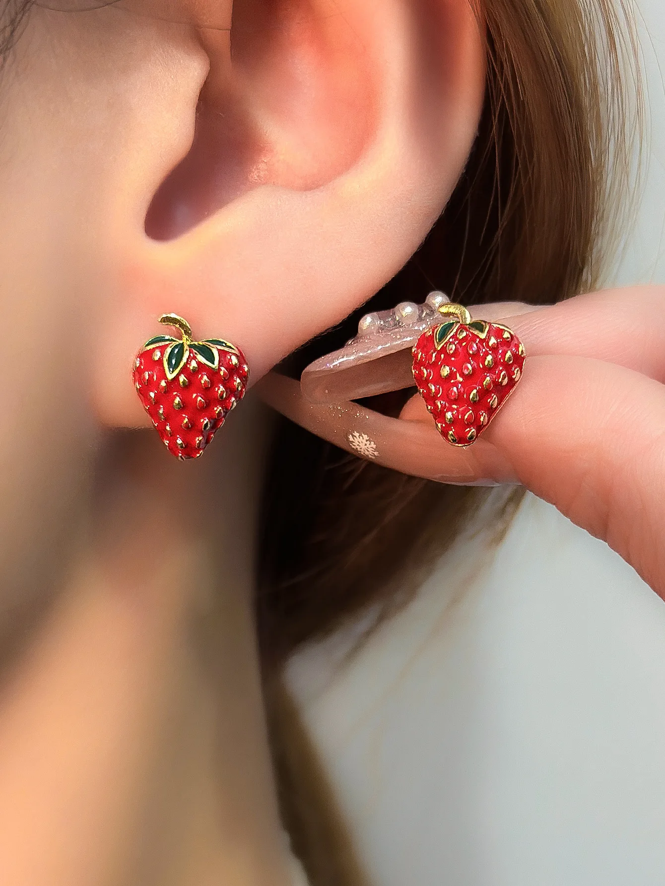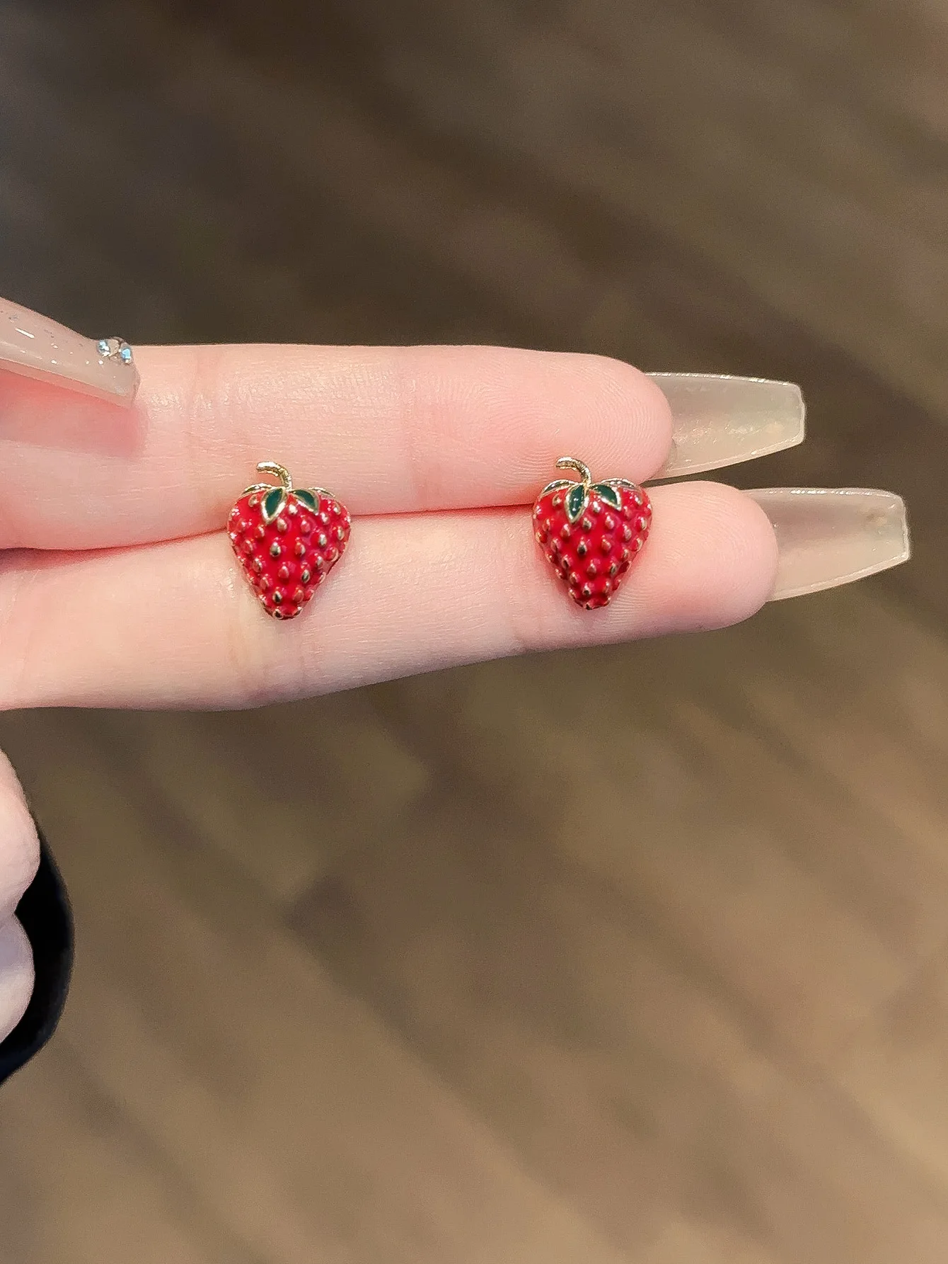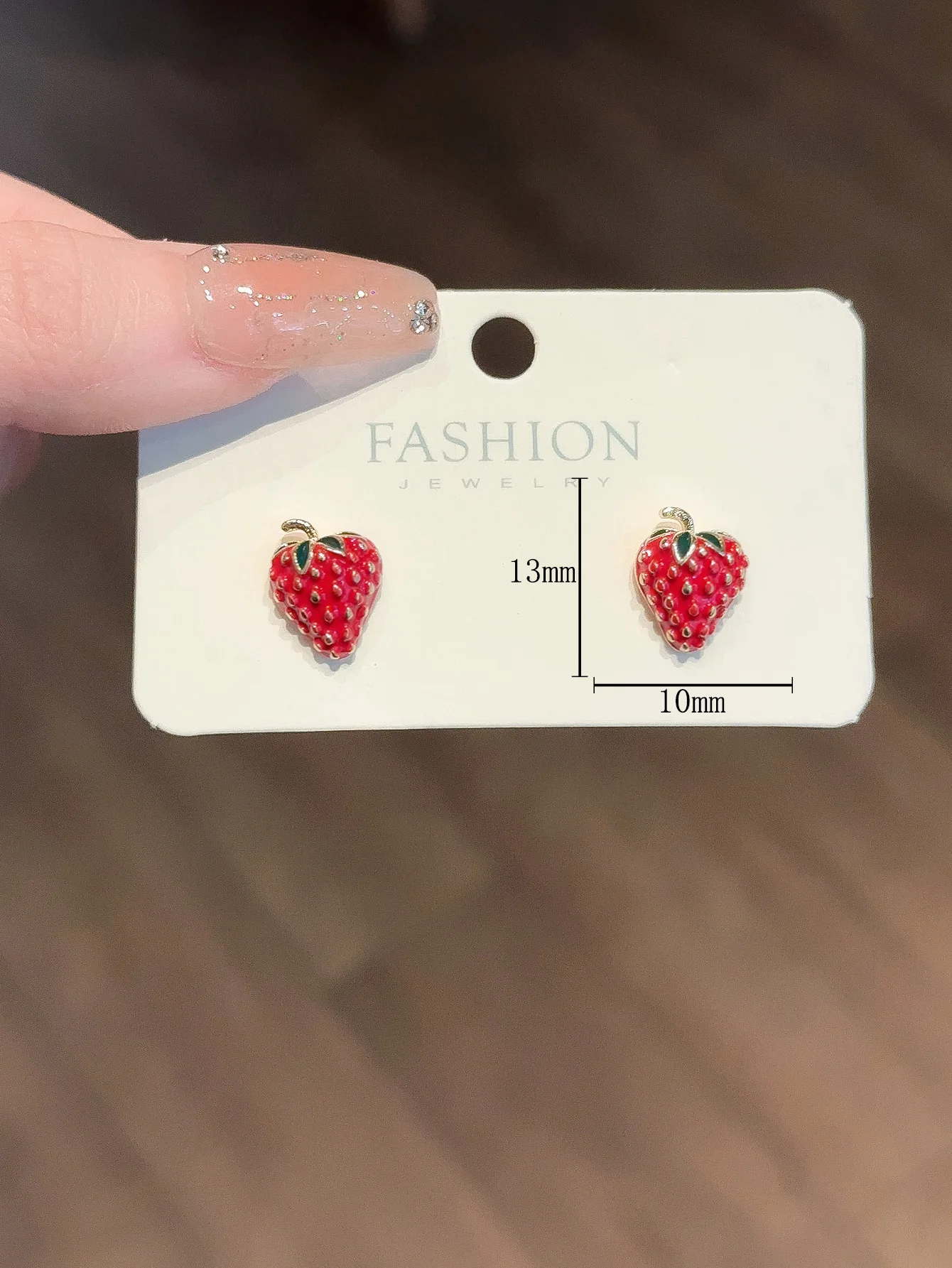 Cute Sweet Red Enamel Strawberries Small Stud Earrings for Women Girls New Korean Trendy Charm Fruit Jewelry Accessories Gifts